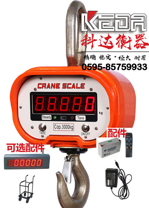 福建科達(dá)衡器有限公司所設(shè)計(jì)生產(chǎn)的漳州吊鉤秤按照數(shù)值顯示的形式可以分為無(wú)線數(shù)傳型電子吊鉤秤(1-50噸)和直視型電子吊鉤秤;其中直視型電子吊鉤秤又可以分為高溫耐熱型電子吊鉤秤(1-30噸),防爆電子吊鉤秤(1-50噸)、高精度電子吊鉤秤(1-50噸)、便攜式電子吊鉤秤(0.1t~1t)、掌上型電子吊鉤秤(手掌稱(chēng) 30kg~300kg)等;按照量程來(lái)分又可以分為:1噸吊鉤秤、2噸吊鉤秤、3噸吊鉤秤、5噸吊鉤秤、10噸吊鉤秤、15噸吊鉤秤、20噸吊鉤秤、30噸吊鉤秤、40噸電子吊鉤秤、50噸電子吊鉤秤。福建科達(dá)衡器所生產(chǎn)的漳州電子吊鉤秤均配有電子吊鉤稱(chēng)專(zhuān)用電池和專(zhuān)用充電器,均可選配無(wú)線大屏幕和小推車(chē)。